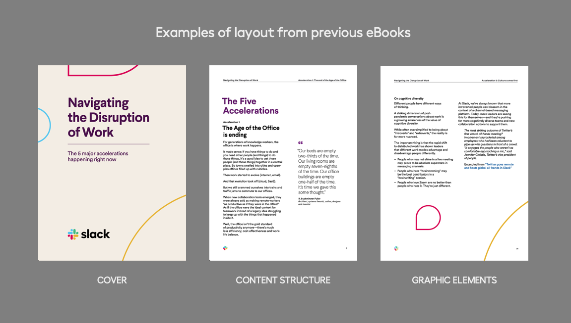 The project design proposal explores initial concepts for layout, content structure, and the integration of graphic elements. The ultimate outcome is a vibrant and playful eBook that joyfully celebrates the remarkable achievements of Slack's amazing customers.